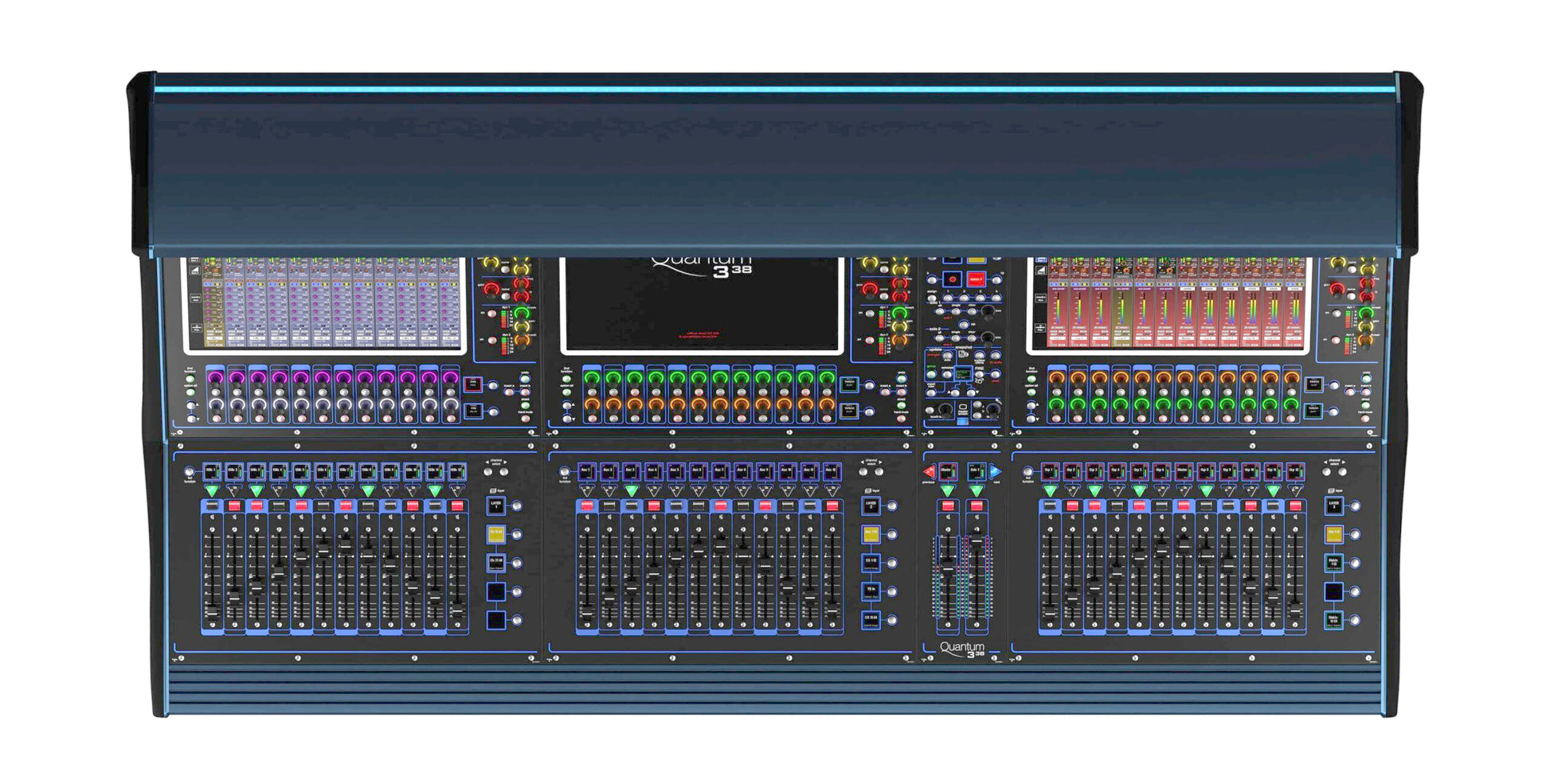The Quantum 338 features three 17-inch, 1000-nit high-brightness multitouch screens, each equipped with a meter bridge and soft quick select buttons for intuitive control. It offers 70 individual TFT channel displays and 38 touch-sensitive faders arranged in three banks of 12, plus two user-assignable faders, providing extensive hands-on mixing capability.