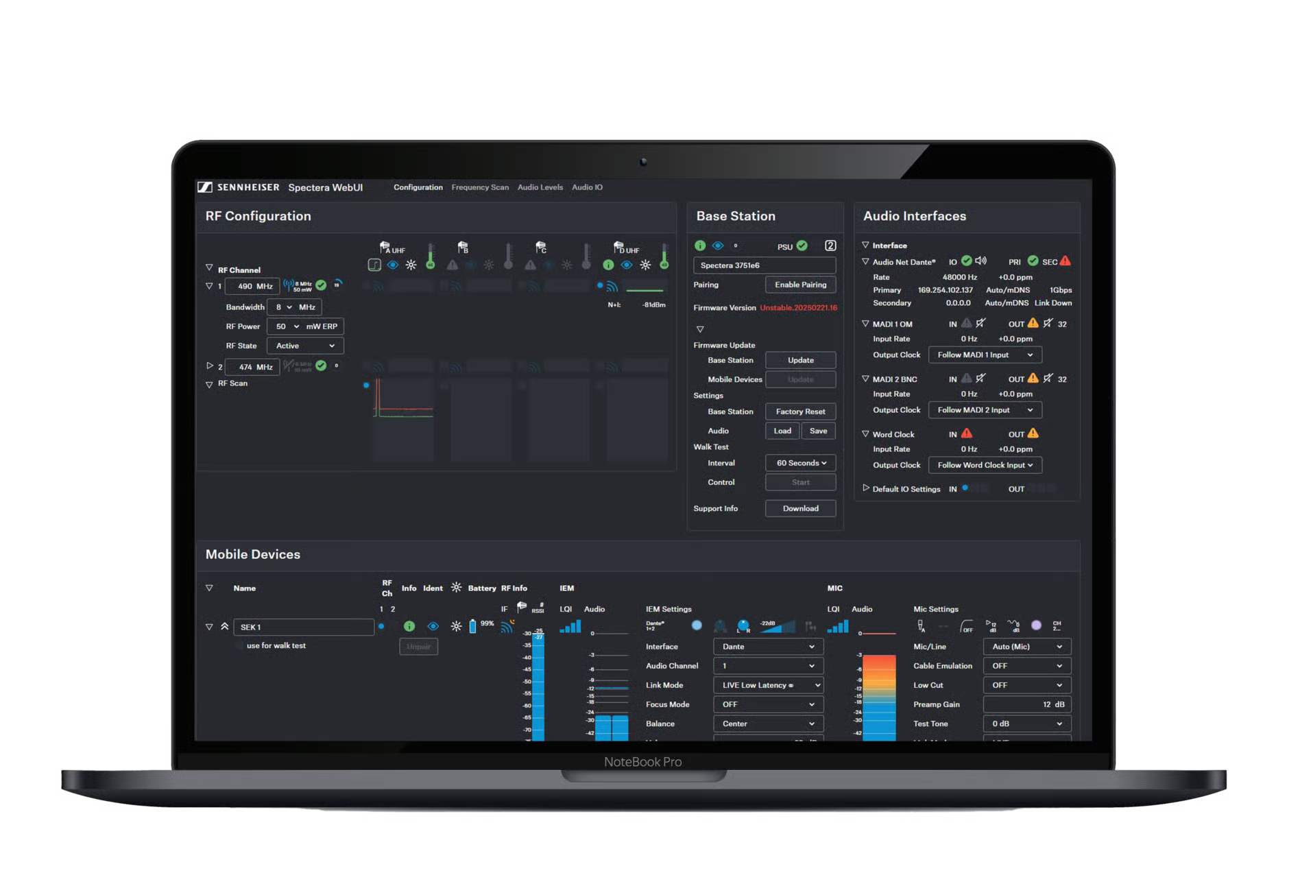 - Visibility of IEM volume, latency, audio level and settings, RF health, battery status, and more
