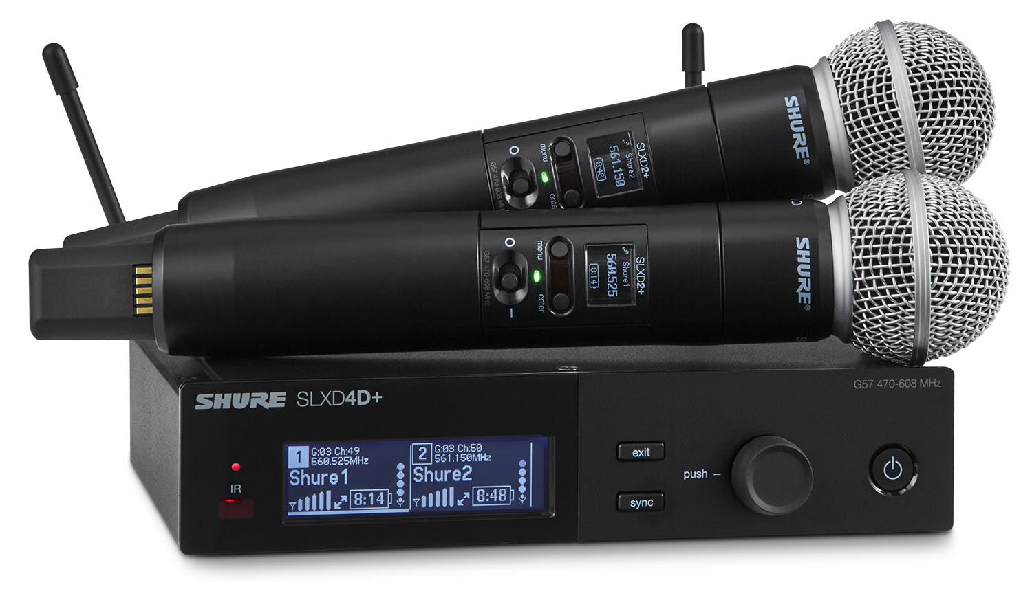 SLX-D+ Digital 2-Channel Wireless Microphone System, includes 1 SLXD4D+ Dual Receiver (1/2 rack) with Bluetooth remote monitoring and control, Audio Summing, AES-256 encryption, Digital Feedback Reduction, networkable, controllable via WWB and Mobile APP, 2 SLXD2+ Handheld Transmitters with SM58® Microphone Cartridge (dynamic, cardioid), rack mount kit, 4 AA batteries, 2 1/4 wave antennas, 2 bulkhead adapters, 2 22" BNC cables, 2 carrying bags, frequency band G57 (470-608 MHz, tuning range 138 MHz)