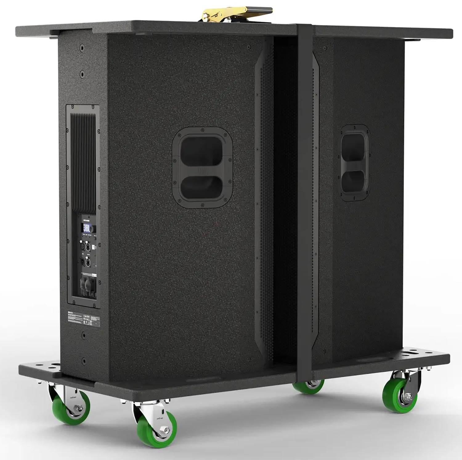 Deux woofers de graves de 12 pouces, un haut-parleur médium de 6,5 pouces chargé par pavillon, et un moteur de compression à diaphragme annulaire de 1,5 pouce